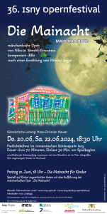 Speziell auf Kinder zugeschnitten bieten wir eine Aufführung der märchenhaften Oper „Die Mainacht“. Angeleitet von der Sängerin und Theaterpädagogin Elsa Kodeda dürfen Kinder dabei auch selbst in einigen Szenen auf der Bühne im Schlosspark mitspielen. Und das inmitten der ausgebildeten Opernsänger und dem Klang des Festivalorchesters.